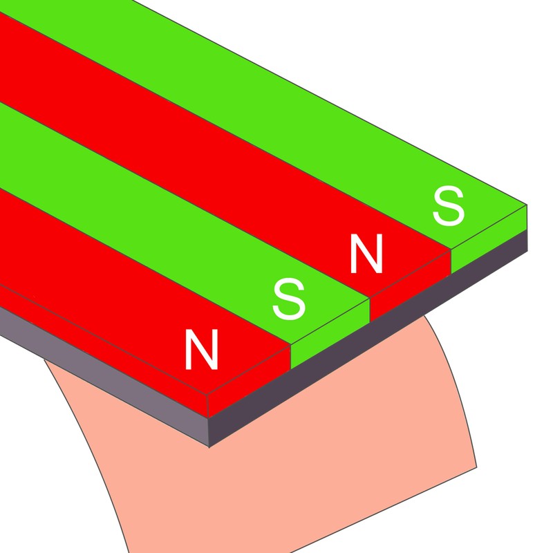 Hochwertiges, flexibles Magnetband, einseitig magnetisiert (Polwechsel längs), rückseitig stark selbstklebend ausgerüstet, für leicht lösbare magnetische Verbindungen.