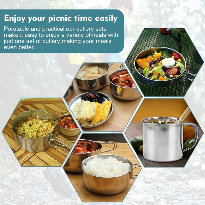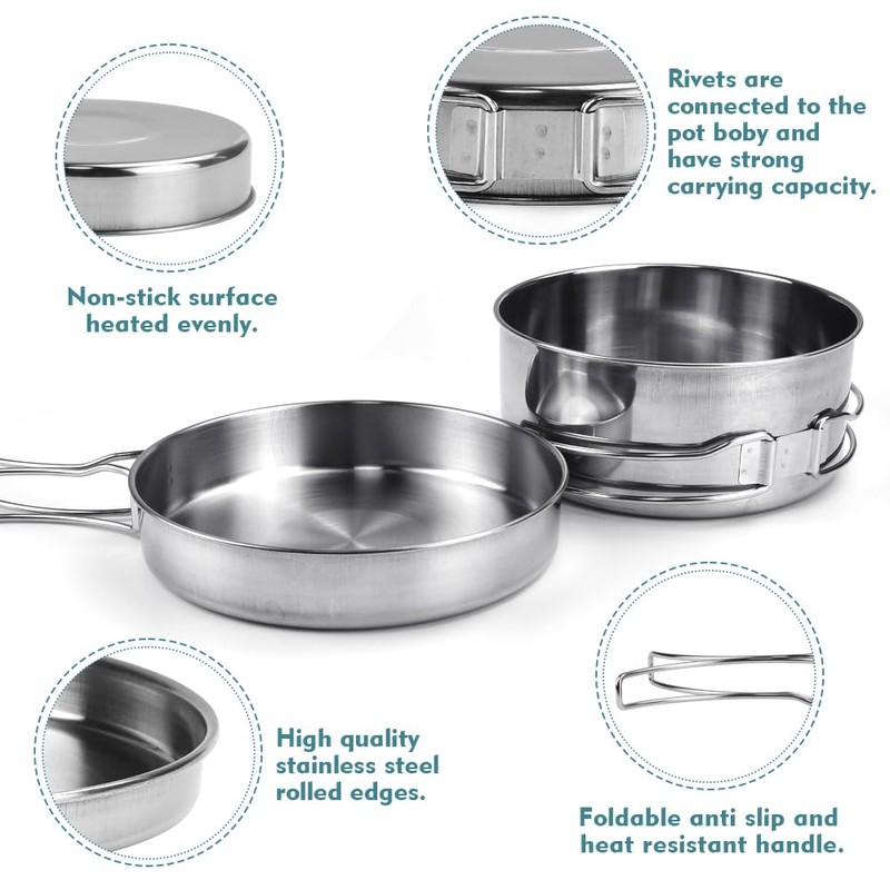 Pot handles can be folded down to a smaller size and pots and pans can be stacked on top of each other to save space. The set features a nest structure, a compact and stackable stainless steel cooking set size, pots and pans can be stacked, space-saving, easy to carry and can be put in a backpack.