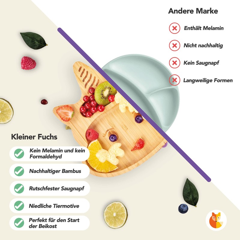 • Stylish and modern: the stylish baby plates with suction cup in the shape of cute animal motifs are a real eye-catcher. This unique bamboo plate baby offers toddlers from the 9th month the perfect start to complementary foods.