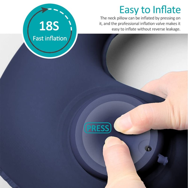 - 【Inflates With A Button】 The travel neck pillow can be inflated by pressing on it, no need to blow into the pillow with your mouth. It has a built-in inflation pump that makes it the easiest and fastest travel pillow, inflate by repeatedly pressing built-in inflation pump,easily adjusted or deflated easy to store. Complete inflation in as little as 18 seconds.