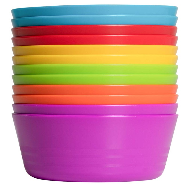 - Cuencos coloridos para niños: juego de 12, 6 colores diferentes, 2 tazas de cada color. Fabricado con plástico de polipropileno de alta calidad de peso ligero, duradero, resistente a la rotura.