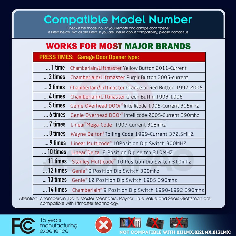 - Not Compatible with 811LMX,812LMX,813LMX! Works for Liftmaster/Chamberlain/Sears Craftsman garage door openers with a Yellow, Purple,Red/Orange, Green Learn buttons.Works for Linear/Genie/Wayne Dalton Garage Door Openers .