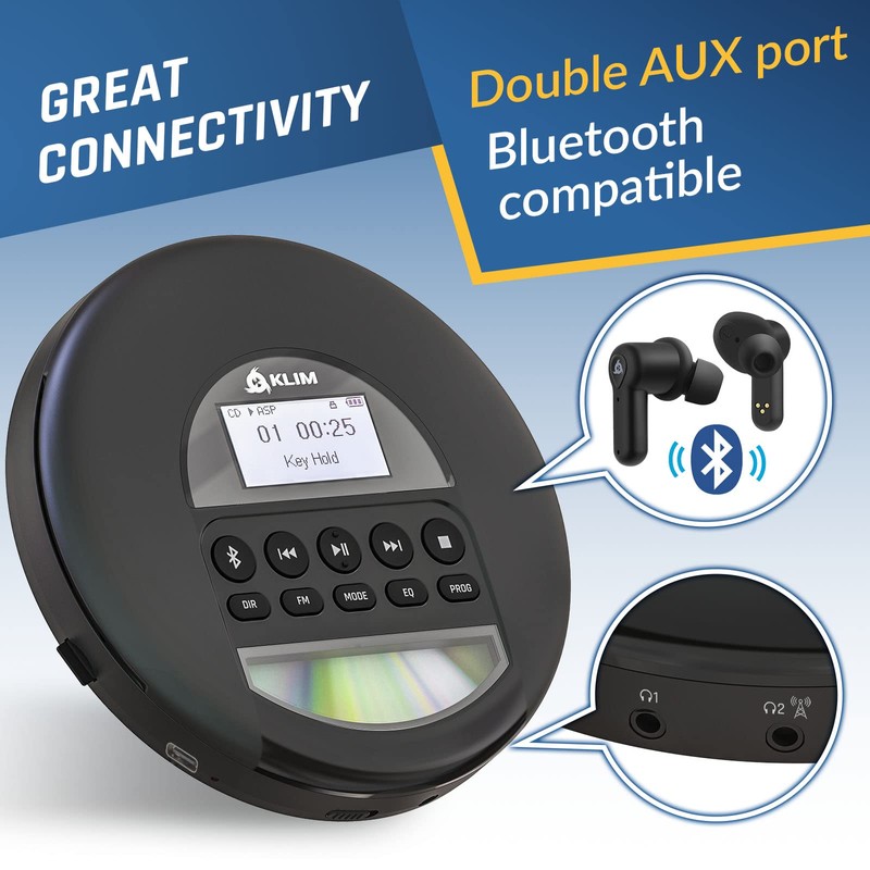 KLIM Nomad - Portable CD Player with Long-Lasting Battery - with Headphones - Radio FM - Compatible MP3 CD Player Portable - TF Card Radio FM Bluetooth - Ideal for Cars - Black