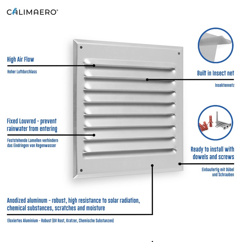 - calimaero WGQ weather protection grille serves as a wall grille for ventilation pipe cover. Ready to install with dowels and screws included. Anodized aluminium is durable, versatile and easy to maintain. Due to its high resistance to sunlight, chemical substances, scratches and moisture, this material can be used for both indoor and outdoor applications.