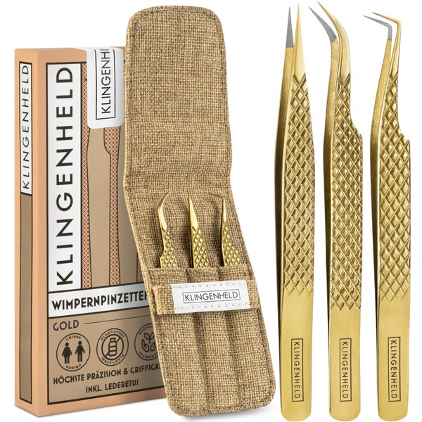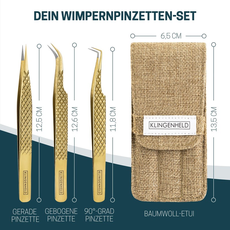 KLINGENHELD® NEU Profi Wimpern Pinzetten Set mit ComfortGrip-Spitzen & Anti-Rutsch Griff - Maximaler Halt & höchste Präzision - inkl. Baumwoll-Etui 100% nachhaltig - Pinzette Wimpernverlängerung