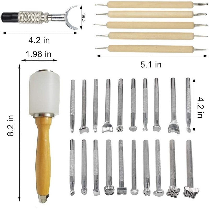 - 🔨Material: The hammer head is made by reinforced nylon and the handle is made of solid wood. The rotary knife is made of alloy steel, very beautiful and sharp. Leatherworking embossing tools are made of alloy steel, and liners are made of wood and steel. These digital and letter stamps all made in extremely strong heavy duty alloy steel for strong impact and long life service.