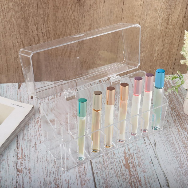 Klmnop Rollerball Perfume Organizer, 24 Grids Clear Acrylic Perfume Organizer Holder with Lid, Container Storage for Mini Perfume, Perfume Sample and Lipstick(Clear)