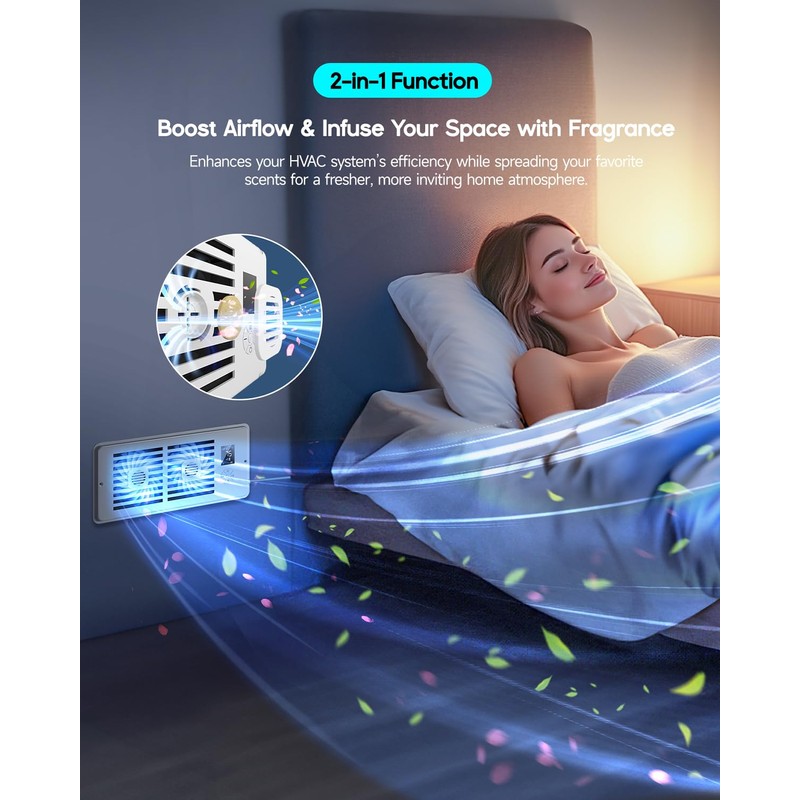 • 【Breathe Better, Smart Air & Scent in One Fan】This register booster fan not only intelligently detects room temperature and automatically starts operating to quickly balance indoor airflow, but it also features a built-in aroma compartment for a personalized scent experience. Simply add your favorite perfume or essential oil to the included four replaceable cotton pads, and refreshing fragrances will naturally diffuse with the airflow, filling your space with pleasant aromas.