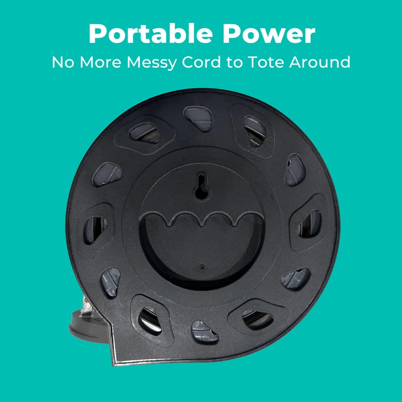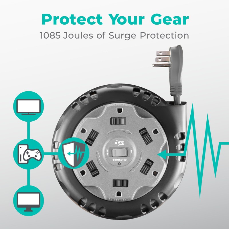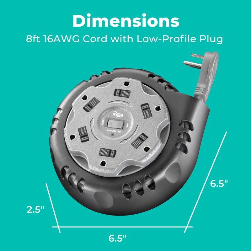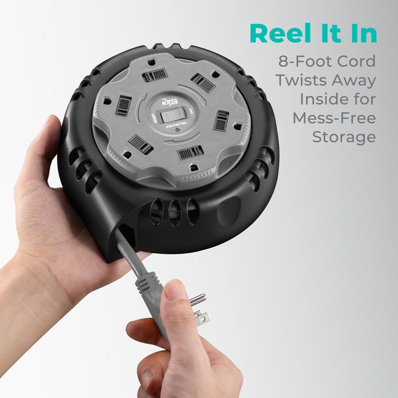 - CONVENIENT: This self-contained and portable surge protector features a 8-foot 14/3 retractable extension cord that manually winds into the internal cord reel. The durable PVC cord has a low-profile plug to easily fit behind furniture.