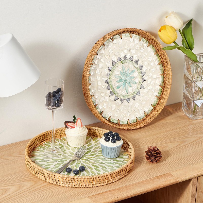 Kmelep Round Rattan Tray with Mother of Pearl Inlay, Rattan Serving Tray with Wooden Base, Decorative Wicker Basket for Table Decor, Storage and Display of Coffee Bread Food Fruit (Bohemia)
