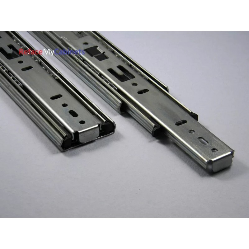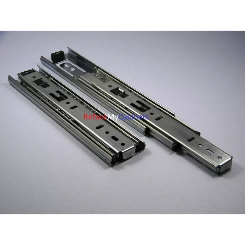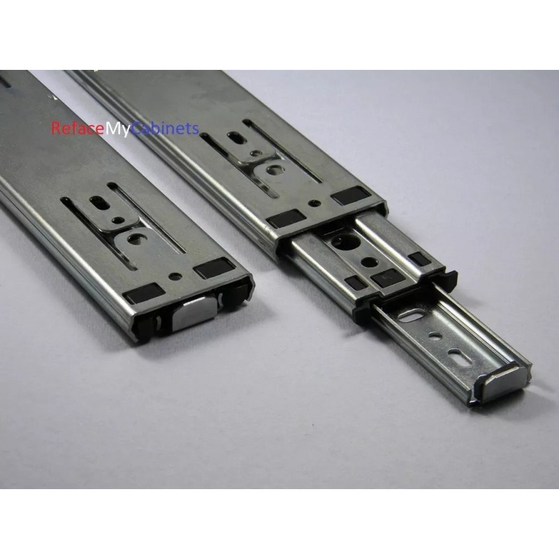 KNAPE & VOGT - KV 8400 Precision Ball Bearing Drawer Slides Full Extension Load Rating 100 lbs High Quality-3 Bearings Per Inch Of Race Exceptionally Smooth Quit Performance 32mm Standard Hole Pattern You Will Receive (2) Slides, One For Each Side Screws & Included Color Anochrome Lever Disconnect Polymer Stop Cushions Non Handed Side Mount Side Clearance Required From Cabinet Side To Drawer Box 1/2" + 1/32 - 0 Drawer Box Member Must Be Set back 1/8" From Drawer Front Recommended Max Drawer Width - 24" Bulk Packed From New Carton 100 lb. class full extension drawer slide features an ergonomically designed push-in lever release for easy drawer removal. The reversed flex tabs allow improved slide performance with side clearance tolerance adjustments. 8400 is an non-handed design with traditional 32mm hole pattern that supports industry standards. Recommended maximum drawer width of 24 |