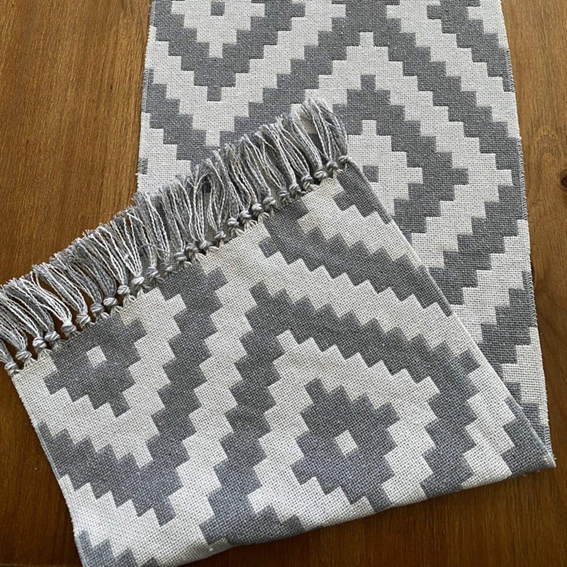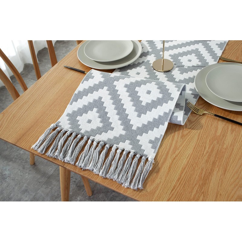 KnBoB Cotton Linen Beige Grey Geometric Puzzle Pattern with Tassels Decorative Table Runner Autumn Size 32 x 160 cm
