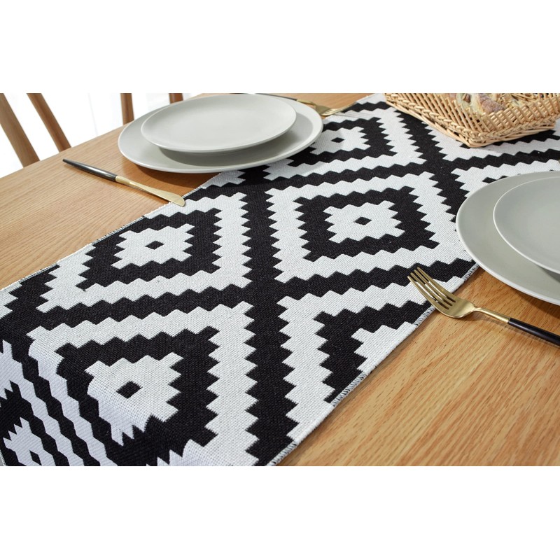 KnBoB Cotton Linen Black White Geometric Puzzle Pattern with Tassels Table Runner for Wedding Party Event Table Decoration Size 32 x 180 cm