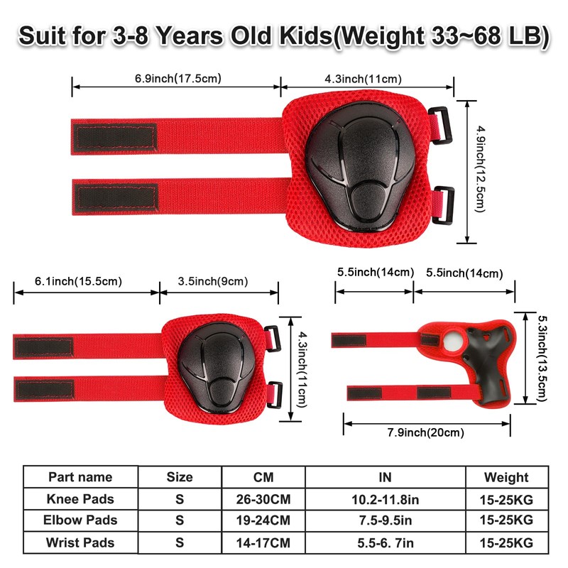 - Adjustable for Growing Kids - The NIKISHAP Kids Protective Gear Set includes upgraded adjustable elastic straps and Velcro closures, ensuring a snug and secure fit for knees, elbows, and wrists. The set comes with 2 knee pads, 2 elbow pads, and 2 wrist guards, and is available in two sizes: Size S for kids aged 3-8 and Size M for kids aged 7-14.