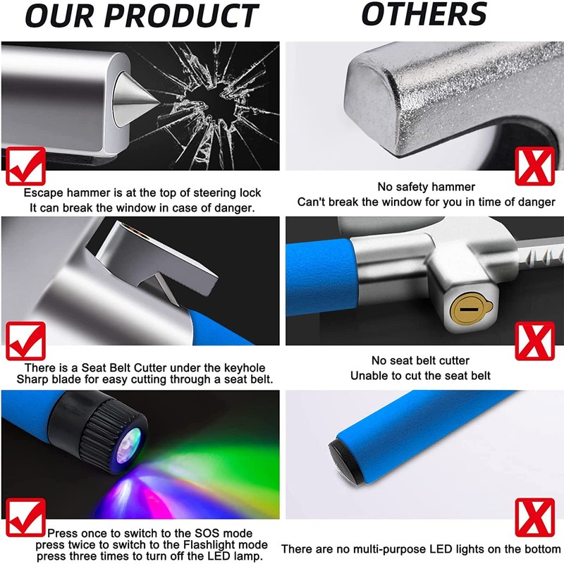 - Emergency-Escape Tool: Under the keyhole of the Steering Wheel Lock, there is a Seat Belt Cutter.Sharp blade for easily cutting through a seat belt,Escape hammer is at the top of steering lock.It can break the window in case of danger.Trusted by first responders, Law Enforcement and EMTs and carried by more than 8 million motorists worldwide. seat belt cutter and window breaker saves a life on average every 15 days