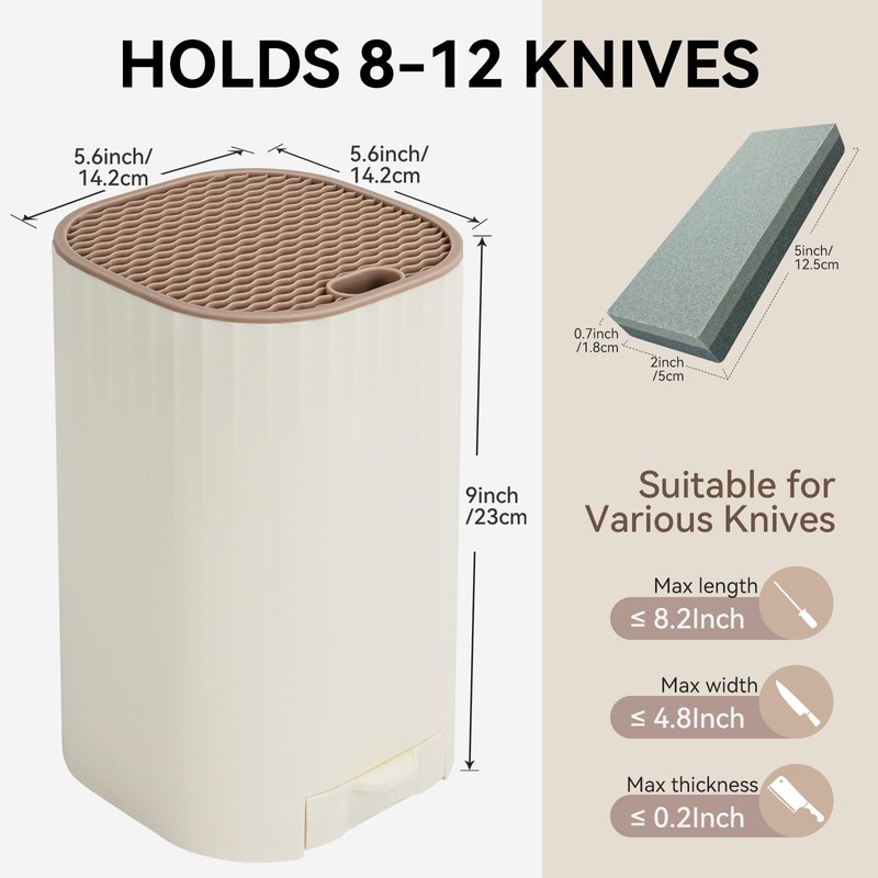 - 【Versatility】Not only suitable for a variety of knives, this knife block without knives has a new storage slot for scissors and sharpening strips, which is convenient for the centralized storage of other kitchen utensils and gets rid of the mess in the kitchen