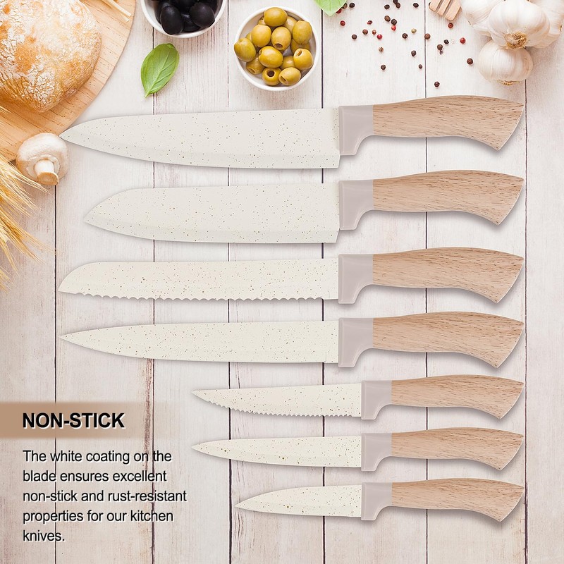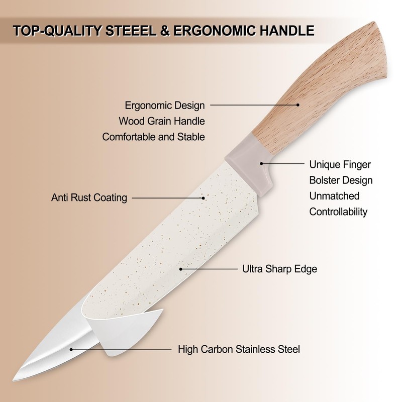 - High-Quality Material to Cutting Items - - The kitchen knife set is made of premium high carbon stainless steel . Professional-level sharpness ensures precision cutting and easy to use. Stainless steel makes sure corrosion resistance and titanium enhances non-stick properties, which can withstand high-frequency use or use after long periods of idle.