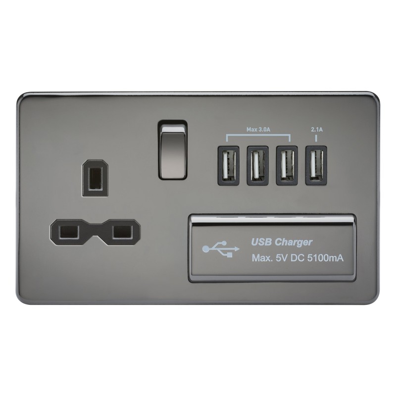 Knightsbridge SFR7USB4BN Screwless 1G 13A Switched Socket with Quad USB Charger 5V Dc 5.1A Nickel with Black Insert