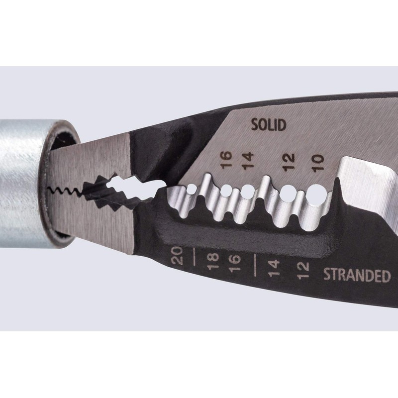 KNIPEX Tools new patent pending Forged Wire Stripper is a true game changer. It strips solid and stranded wire 10-20 AWG. Wire locating ridges make it easy to find stripping holes. It cuts 6-32 and 8-32 screws without threading from either the front or back of the tool. Cutting blades are designed to cut individual wires, NM-B, BX/MC, and battery cable. Lock can be used either right or left handed. Knurled tip and wide flat jaws for better grip. Also includes wire looping groove and gripping area for pipes.