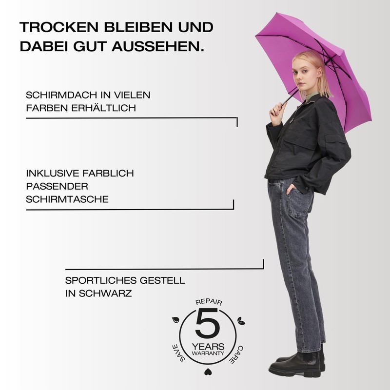 - Easy to use – the sturdy pocket umbrella can be easily opened and closed by hand – the loop on the handle makes it even more handy, the colour-matching umbrella bag protects the umbrella