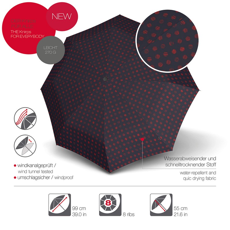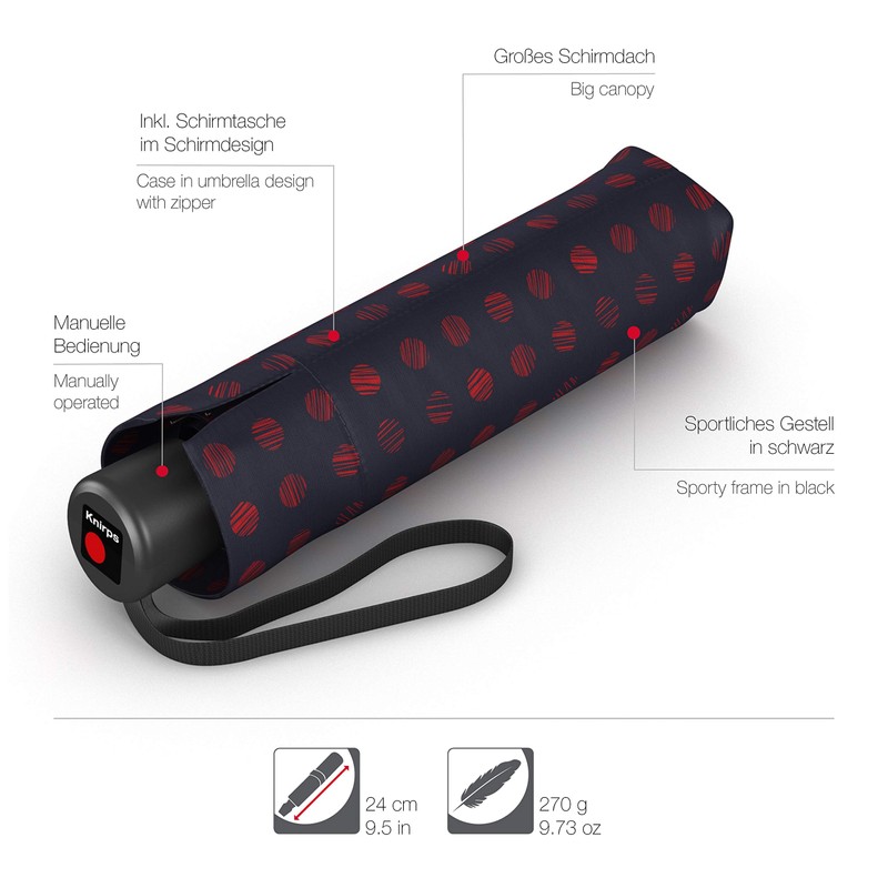 - Box contents: Knirps pocket umbrella A.050 Medium Manual, colour matching umbrella bag with loop