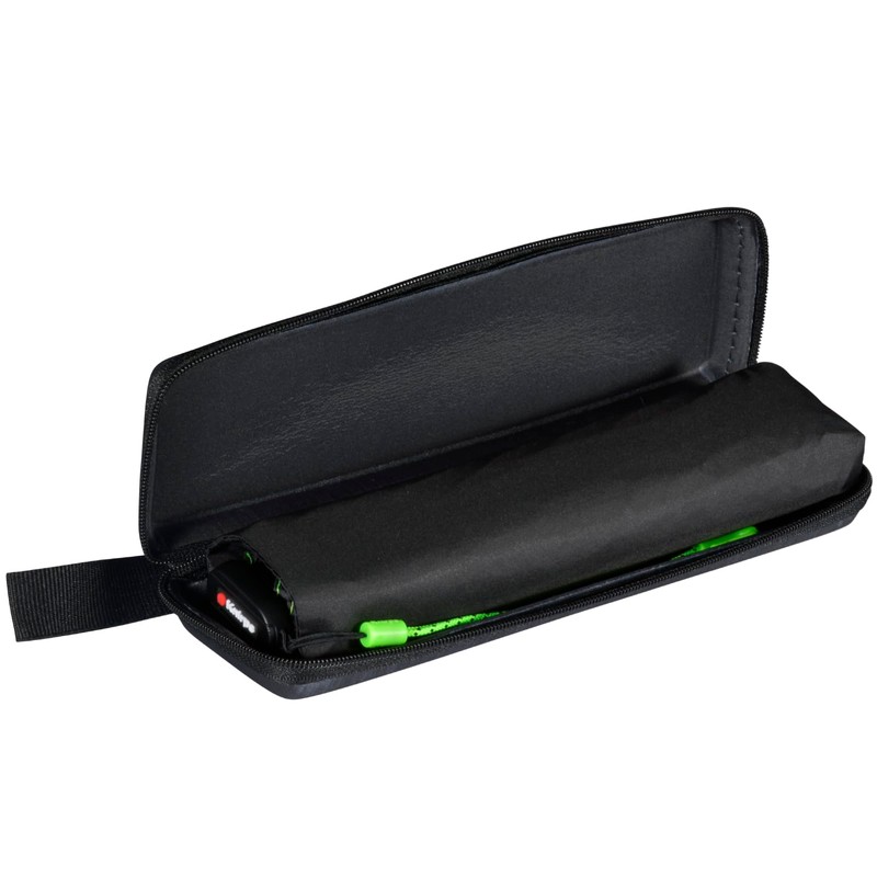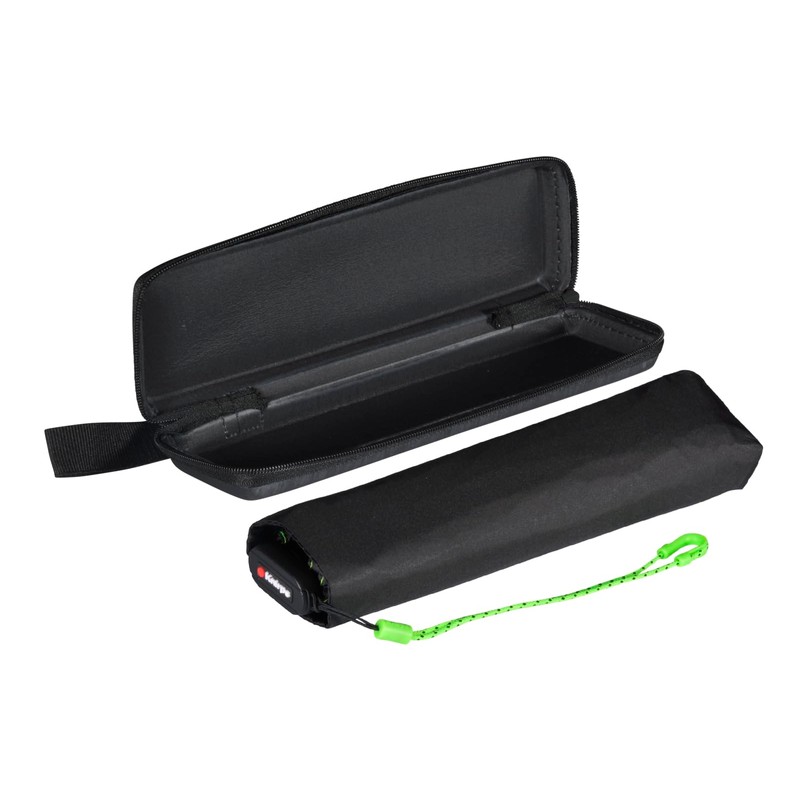 The colour of the canopy is neon black, the material used is made from 100% polyester. Very small, flat and extremely light, the pocket umbrella weighs only approx. 140 g, with case approx. 185 grams. When open, the roof is 90 cm tall. When closed, the umbrella measures a tiny 21 cm. The case is approx. 23 x 6 x 3.5 cm.