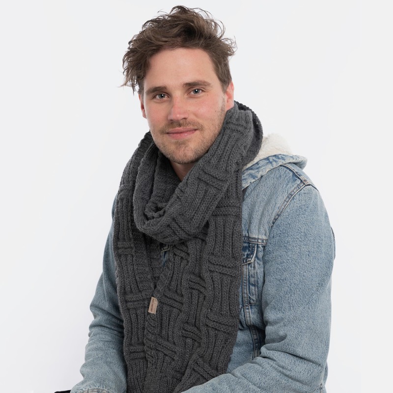 Our Bobby scarf in anthracite has an eye-catching knitted braided pattern. With a length of 2 metres and a width of 30 cm, this long scarf made of milled wool is a warm winter scarf for adults. The neutral, cool colours can be worn by both men and women. This long, dark grey winter scarf is carefully knitted and has a special textured pattern. Only the leather brand label and the wash label are sewn on. In addition to the anthracite colour, this scarf from the Bobby collection is also available in other colours. Combine the scarf with matching knitted hats in the same style.