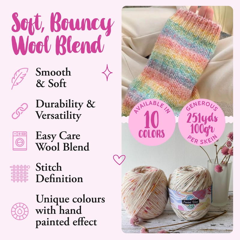 Painted Wool is perfect for knit and crochet apparel including wooly hats, scarves, mittens, shawls, cowls, sweaters and cardigans. New crafters intrigued by uniquely colorful projects will love knitting and crocheting with Painted Wool due to its speckled, variegated, and multicolor colorways. Painted Wool is an especially fun baby yarn!