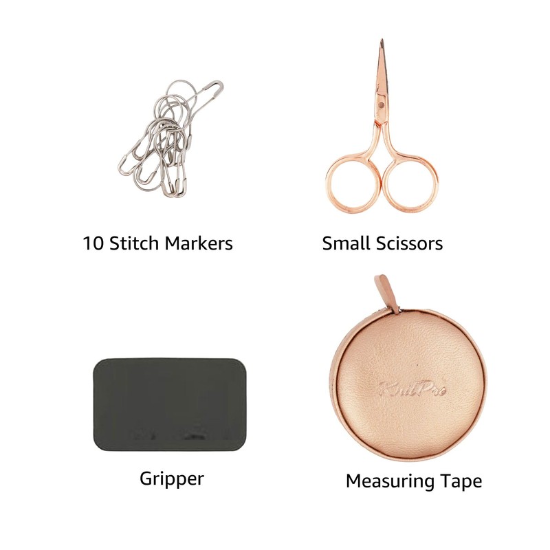 - Complete Crafting Kit: This set includes rose gold scissors, 10 metal locking stitch markers, and a measuring tape, all housed in a chic, beige faux suede case. Perfect for on-the-go crafting, it offers both functionality and style.
