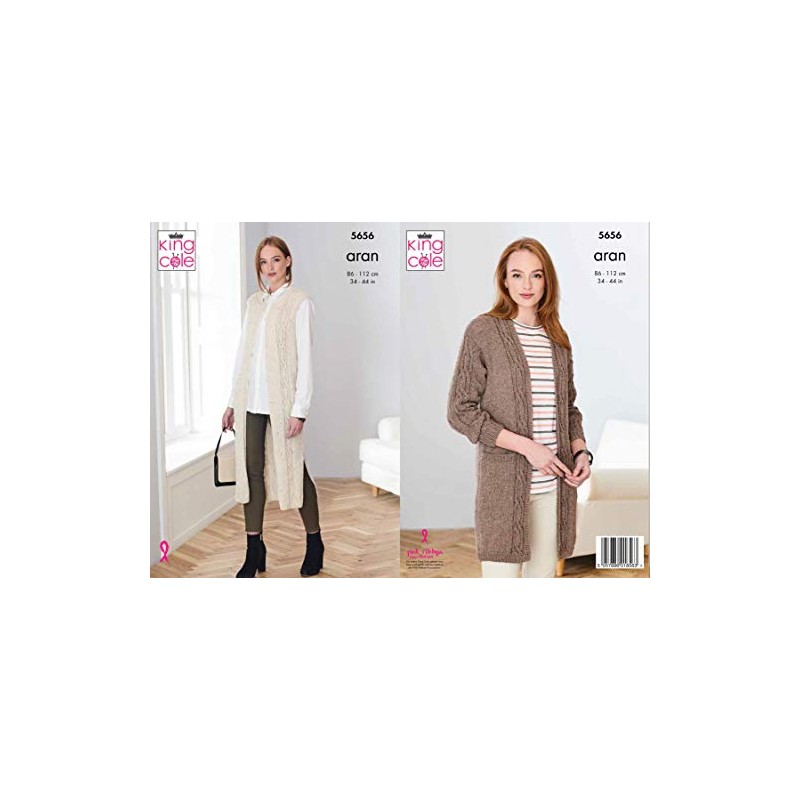 Knitting Pattern Ladies Long Cable Jacket and Long Cable Waistcoat in Forest Aran 5656 King Cole