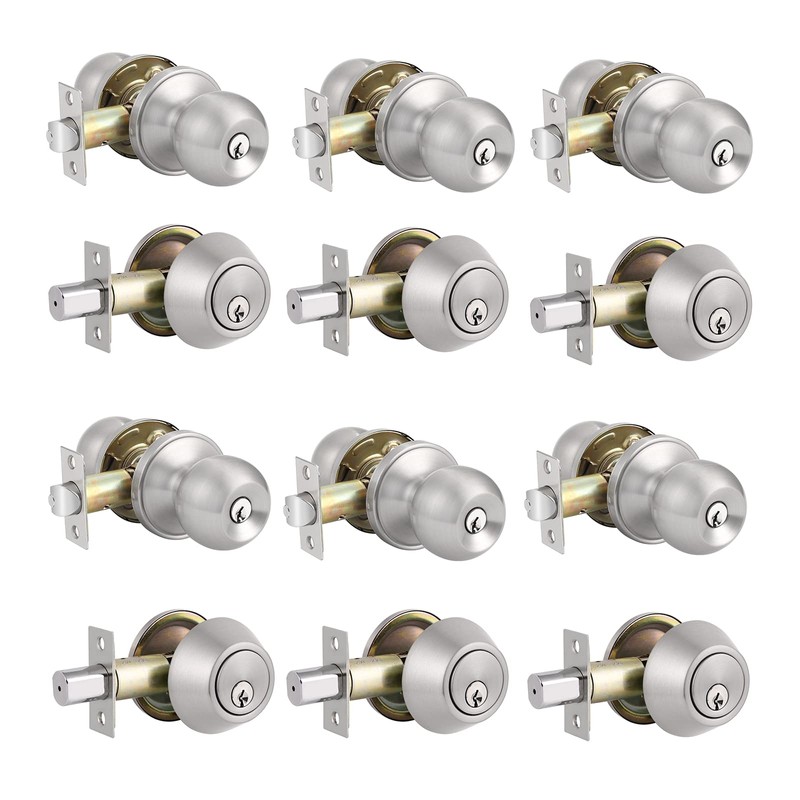 - ★KEYED ALIKE DOOR HANDLESETS★Entry door lever with single cylinder deadbolt in satin nickel finish, the locks and deadbolts are keyed alike per 6 sets in this listing. Designed to complement modern contemporary style interior and exterior doors for commercial and residential applications front entry door handleset lever and deadbolt set.