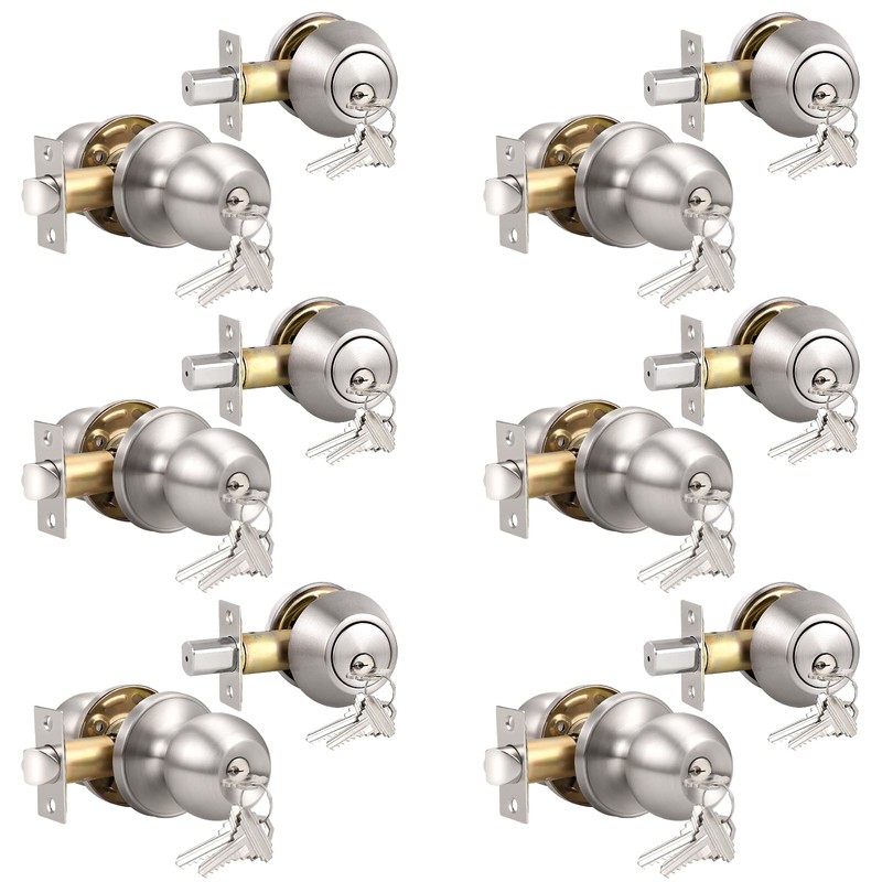 Knobonly Entry Door Knobs and Double Cylinder Deadbolt, Keyed Alike Door Handle Set with Same Keys, Combo Pack for Front Doors-Keyed on Both Side, Satin Nickel Finish, Contractor Pack of 6 Set