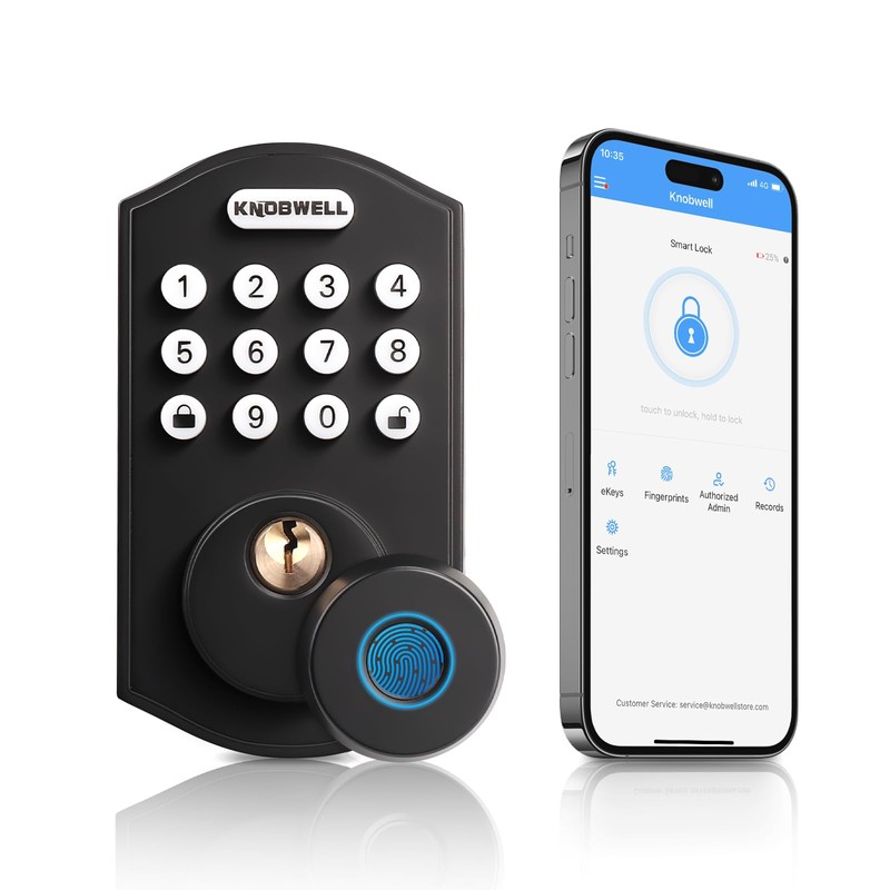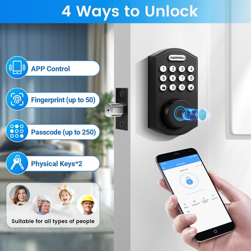 - 【4-in-1 Smart Door Lock】Unlock the door with fingerprint, password, KNOBWELL APP or physical keys; Multiple ways for choosing, suitable for family members of different ages. With all these options, you never have to worry about losing your keys and getting locked out. Simply choose the best unlocking method that suits your needs.