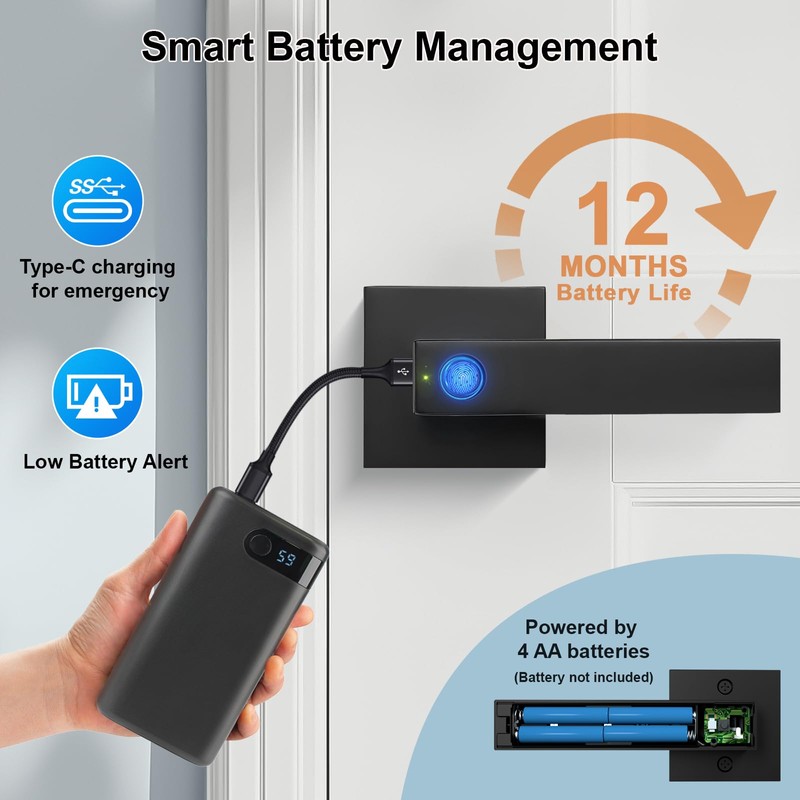 - 【Low Battery Warning】Powered by 4 AAA alkaline batteries(not included), and the batteries life can be up to one year. Not only will the smart door lock alerts you when the battery is low, but you can also check the battery level in the app. If the lock runs out of power, simply recharge it with backup power. It can supply temporary power to so that you can still use the fingerprint reader.