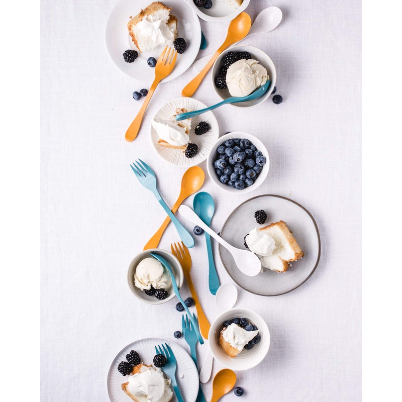 • 4 Orange eco forks and spoons, 4 Blue eco forks and spoons, 4 White eco forks and spoons