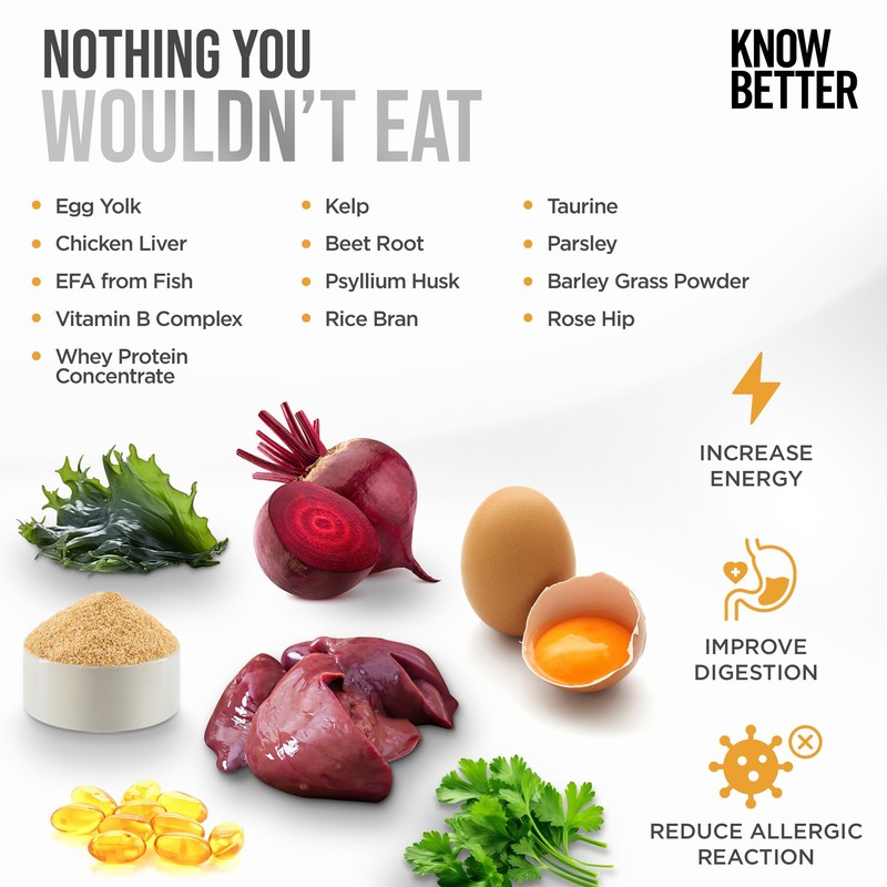 Know Better for Dogs Chicken Recipe is designed to provide your dog with essential nutrients and protein for health and longevity. It makes balancing a raw or cooked meat diet at home, easy and convenient. Prescribed most often by Holistic Veterinarians. This healthy diet is ideal for all life stages and is made with 100% human grade ingredients. No grains of any kind are used. Just add raw or cooked meat and water - Know Better for Dogs is designed to be combined with water, raw or cooked meat, and optional vegetables in the amounts and proportions stated in our literature. It is not a food for dogs on its own nor meant to be a sprinkle-on vitamin supplement. No additional supplementation is necessary when feeding this raw meat based diet. Recipe: 1/2 cup Know Better Premix, 1 1/2 cups water, 2lb (900g) raw or cooked meat ½lb (225g) vegetables, chopped and steamed (vegetables are optional). Larger batches can be made and frozen for convenience.
