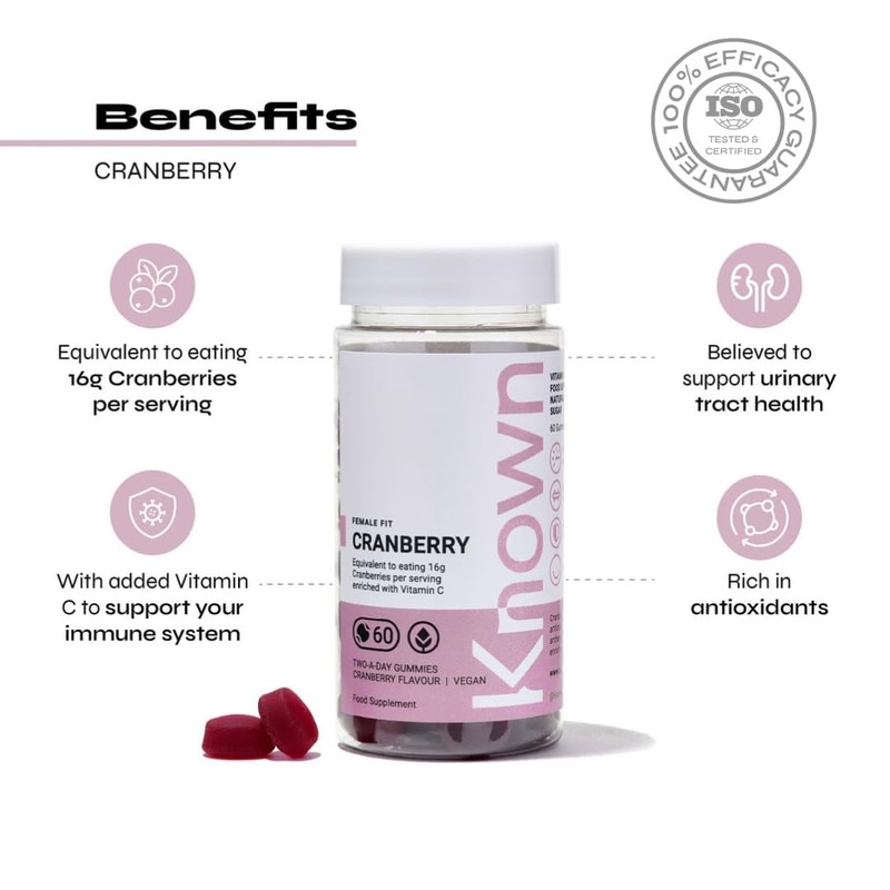 Known Delicious Cranberry Gummies - High-Strength, Equivalent to 16g Fresh Cranberries - Natural Cranberry Flavour - 60 Vegan Gummies, 3 Months Supply