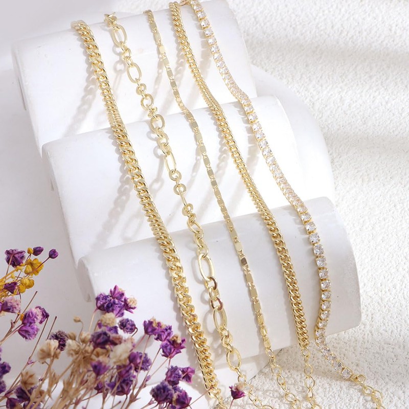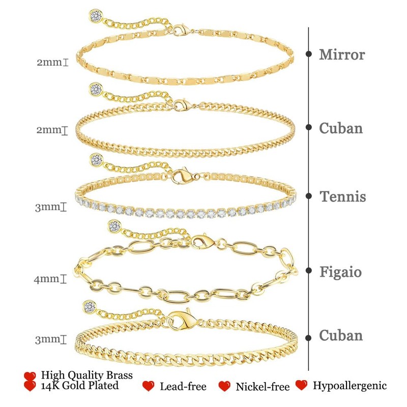 - 5 Separate Layered Bracelets:The 5 stacked bracelets are mirror chain tennis chain figaio chain 2pcs cuban chain ,they are all popular styles, you can be layered or worn alone, even match other necklaces which your favorite,will give you different surprises