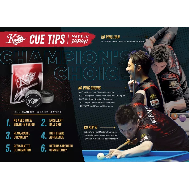 KO Tips consist of 8 layers of premium pigskin leather and have the following features: