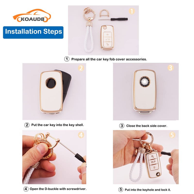 - Package: These car key fob cover kits come with a TPU key fob case (without key fob), 1 anti-lost clasp, 1 bling key ring, 2 small key rings, 1 handmade woven lanyard and a screwdriver. It can make your car key look luxurious and cool, which is a good gift for your friends or family on Christmas, Thanksgiving or birthdays.