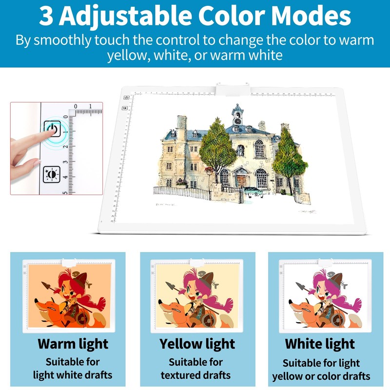 - 【 3 Color Modes and 6-Level/ Stepless Dimmable Brightness 】 On/off and three preset colour temperatures (White, Normal and Warm) can be controlled by a short press on the A3 diamond painting light table power button. Gives a STEPLESS change in brightness by long press on the "sun" touch button, shortly press to choose 6 levels brightness. To meet your different needs.