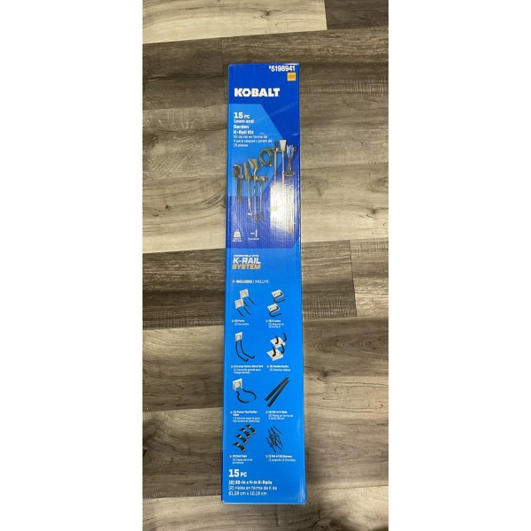 The Kobalt 15-Piece K-Rail Kit is a black PVC storage rail system, 64" long, designed for lawn and garden tools. It includes 8 tool accessories, is magnetic, lockable, and adjustable. Assembly is required for this Canadian-made kit.