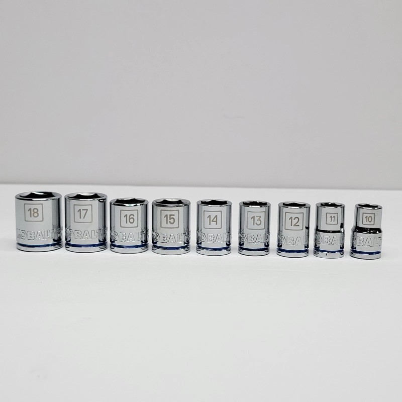 KOBALT TOOLS NEW - 9 PC KOBALT 3/8 INCH DRIVE CHROME METRIC 6 POINT SHALLOW SOCKET SET