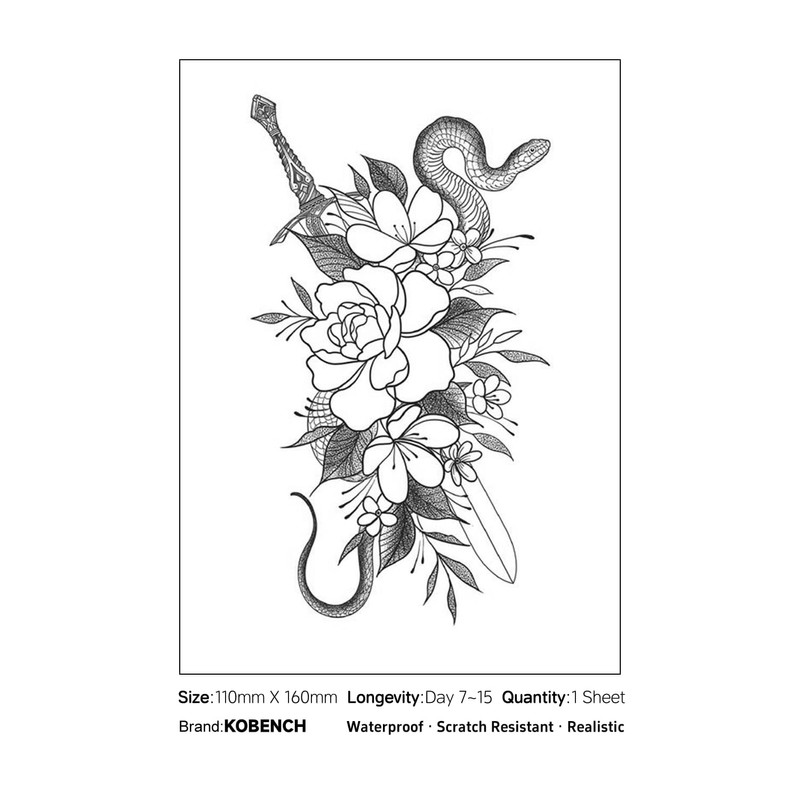 kobench Semi Permanent Tattoos,A Sword Stuck In A Flower A Snake - K68 Design,Waterproof,Easy-to-Apply,Long Lasting 1-2 Weeks, Plant-Based,Snake Tattoos