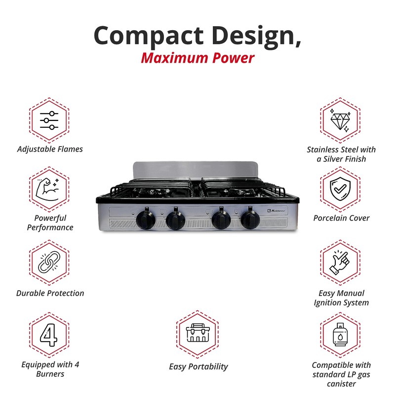 - MANUALLY IGNITED STOVE: With its manual ignition system and compatibility with a standard LP gas canister, you won't need other power sources to fire the stove; just a single standard LP gas canister is enough to power the burners for an extended period.