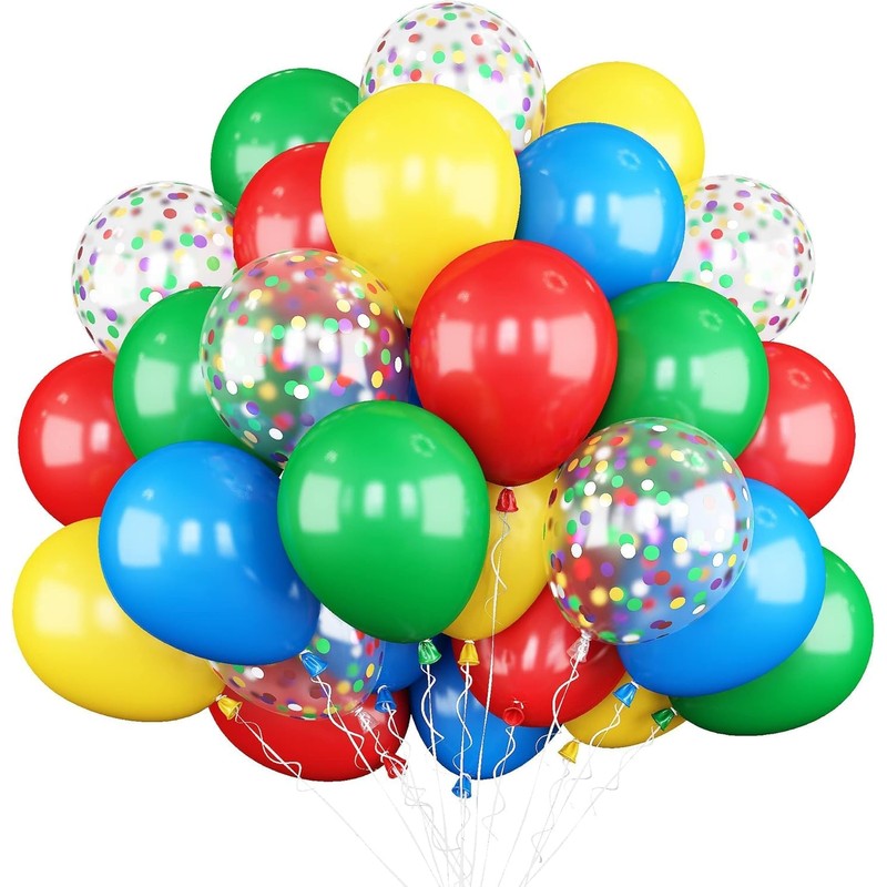- Colour mix: perfect combination of plain balloons in red, yellow, green and blue as well as transparent confetti balloons for a festive look