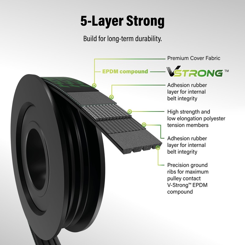 - Exclusive V-Strong EPDM compound formula to ensure extended durability, less noise and superior temperature resistance
