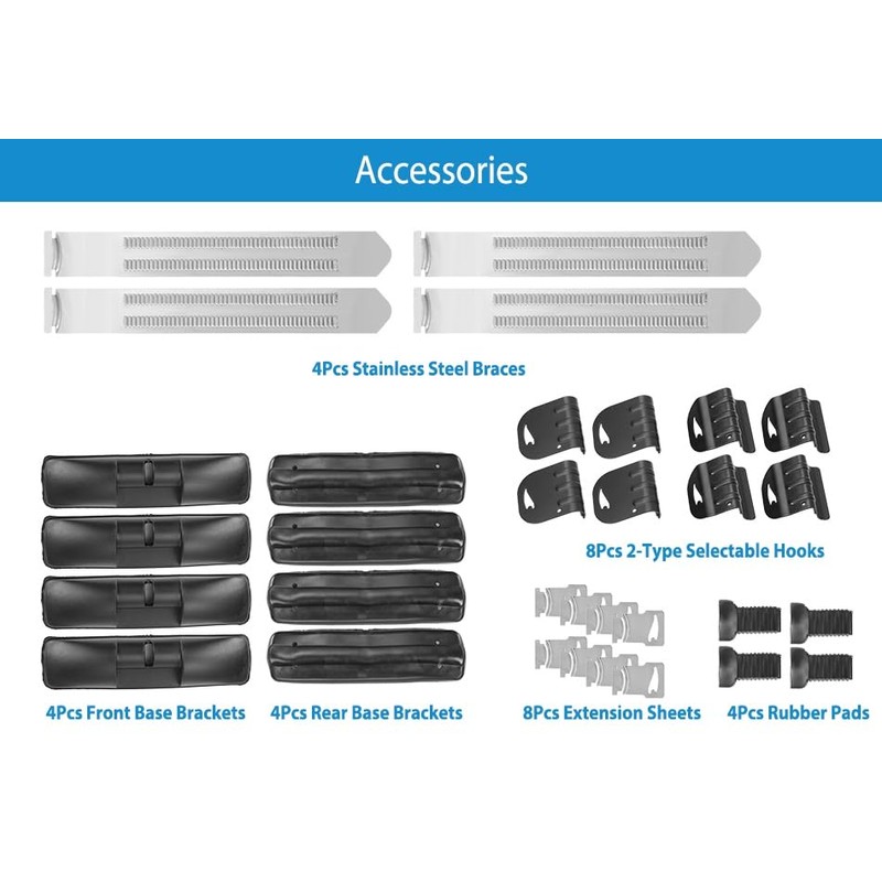 - Easy to install: Come with detailed installation instructions and the installation video. Equipped with 2 x Cross Bars; 4 x Washers 4 x Stainless Steel Sheets 4 x Base Brackets; 4x Rubber Sheets Pads; 4 x Rubber Bracket Pad Covers; 4 x Keys; 4 Screw Nuts; 8 x 2-Type Selectable Hooks and 1 x User Manual. If you meet problems during assembling , please contact us promptly. We will do our best to solve your installation problems.