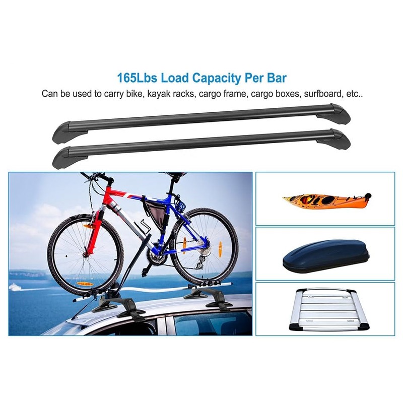 - Upgraded Universal Roof Rack : This universal roof rack cross bars suits for most vehicles which the distance between the rain grooves is between 108cm-114cm/42.52in-44.88in to carry bike, kayak racks, cargo frame, cargo boxes, snowboard, surfboard, etc. Please Make sure your vehicle's roof length is suitable When you are purchasing.