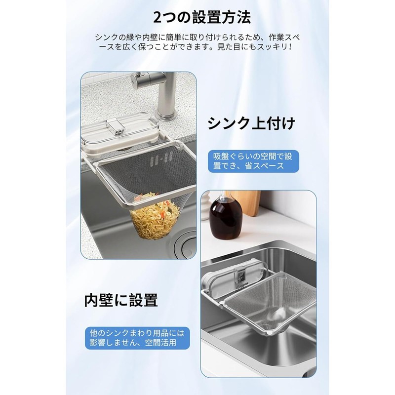- 【水切りネット50枚付属】50枚付属の水切りネットが毎日の煩わしさを軽減!麺汁・茶殻・食べ残しを瞬時にキャッチ。網を引っ掛けるだけでセット完了、汚れたらネットごと交換できる衛生的設計。従来の三角コーナーにありがちなヌメリ防止構造で、ジメジメした嫌な臭いともお別れ。